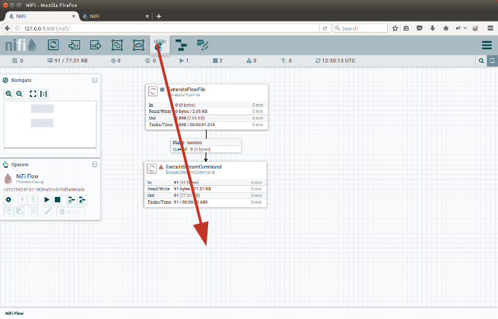 Now we add the ExecuteStreamCommand processor, connect it with the generator on a Success connection.