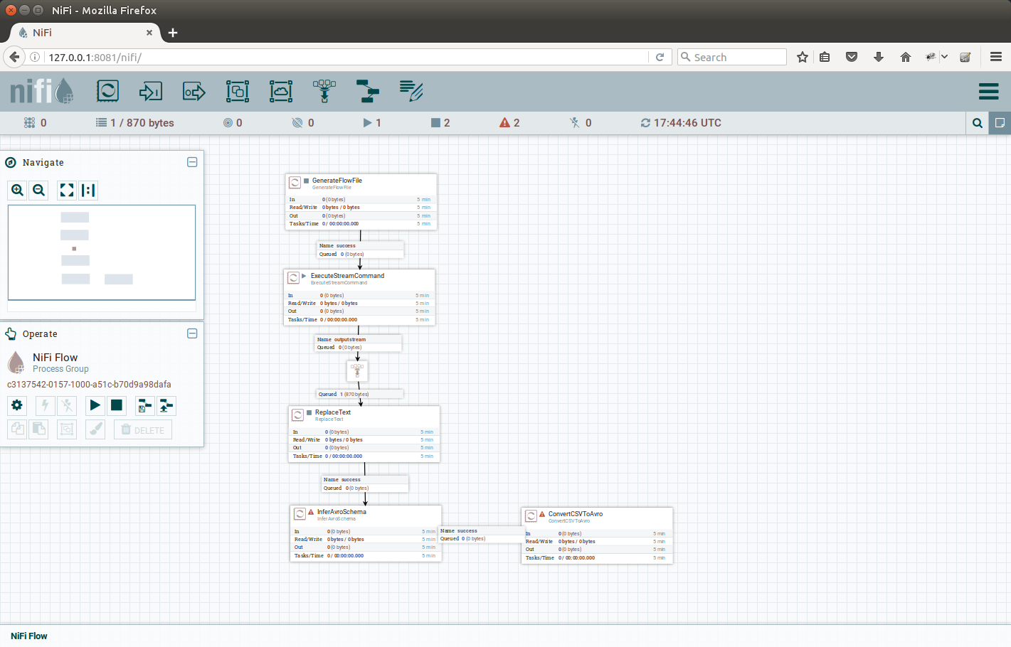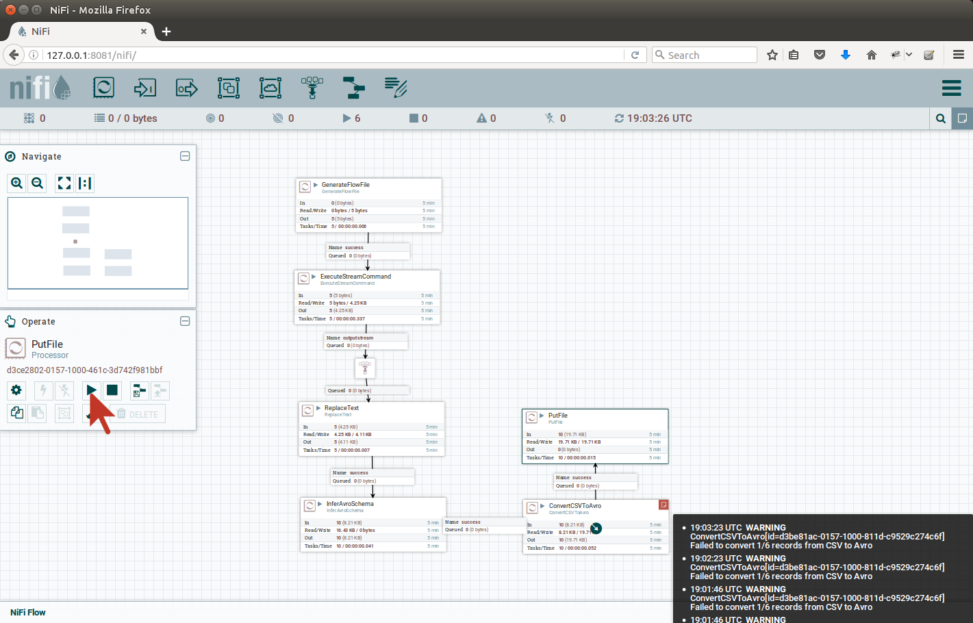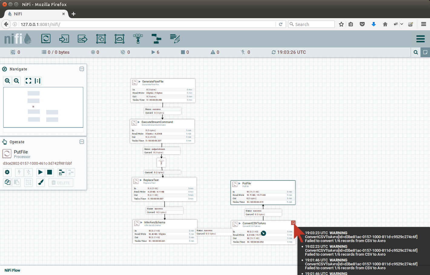 After we started the flow, we noticed red icon in the corner of ConvertCSVToAvro, pointing a mouse there will reveal the errors: