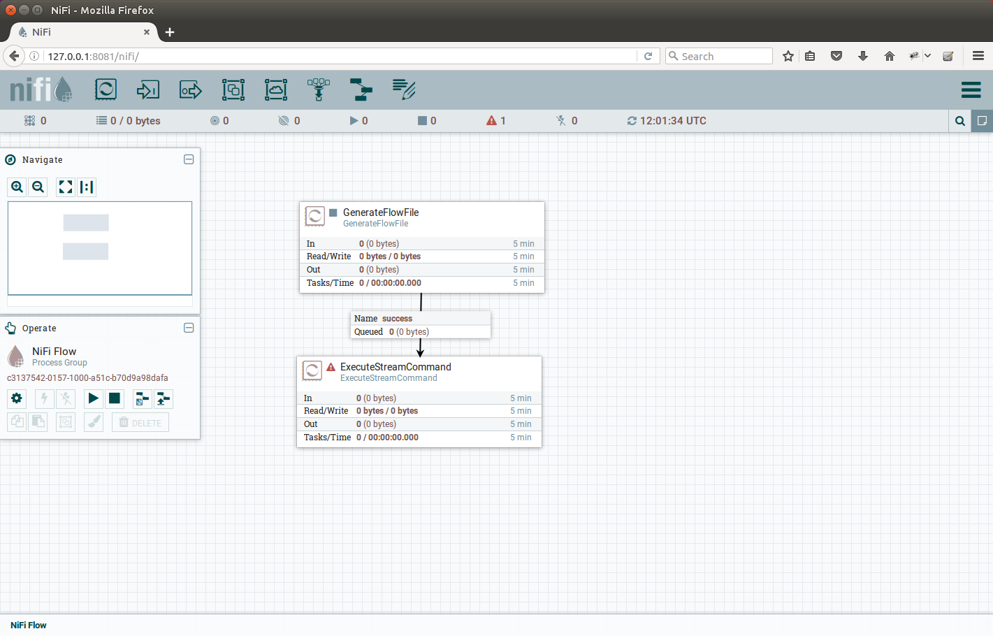 ExecuteStreamCommand processor is connected to the GenerateFlowFile success output |