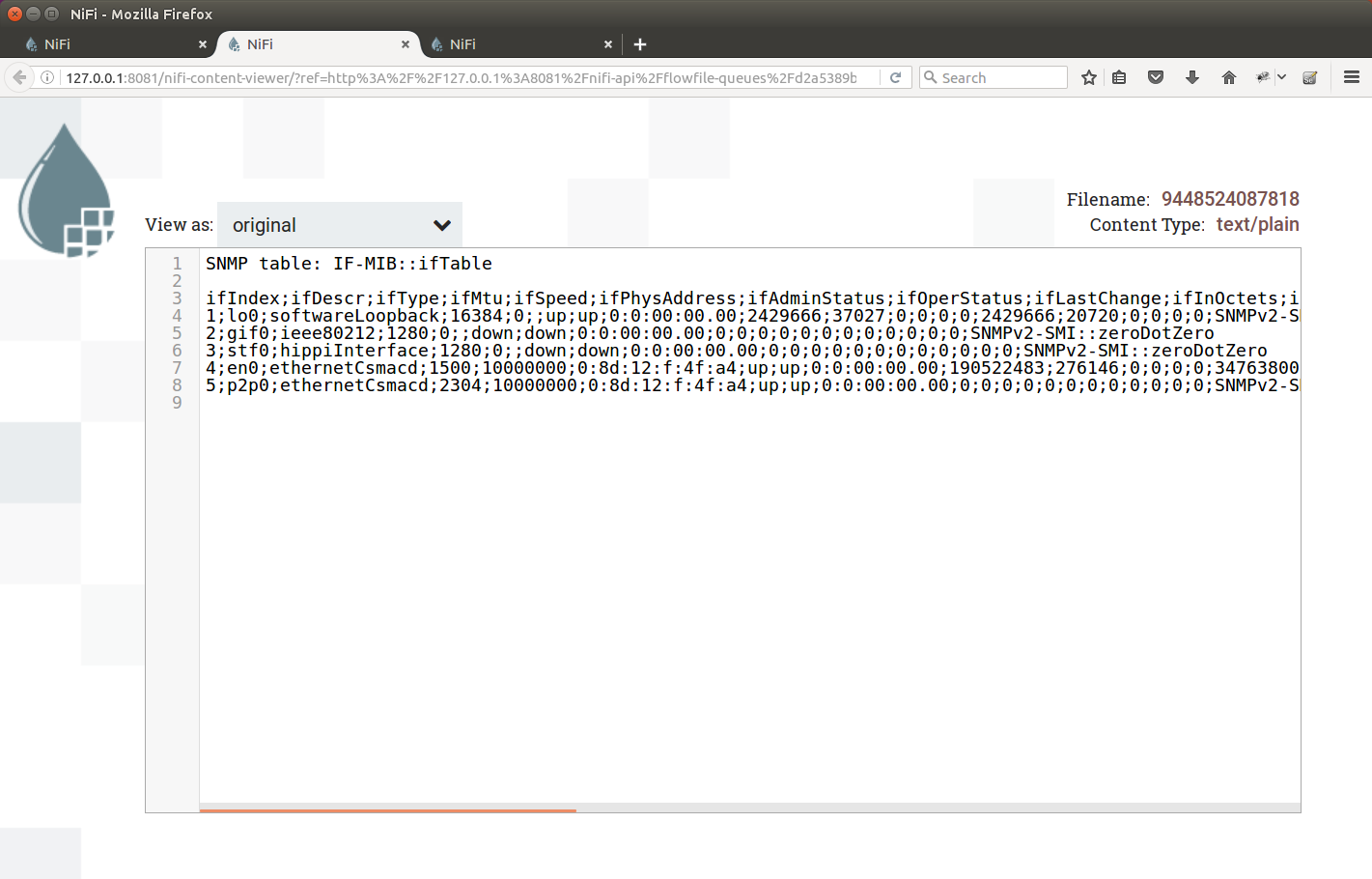 | Viewing file contents using NiFi view file |