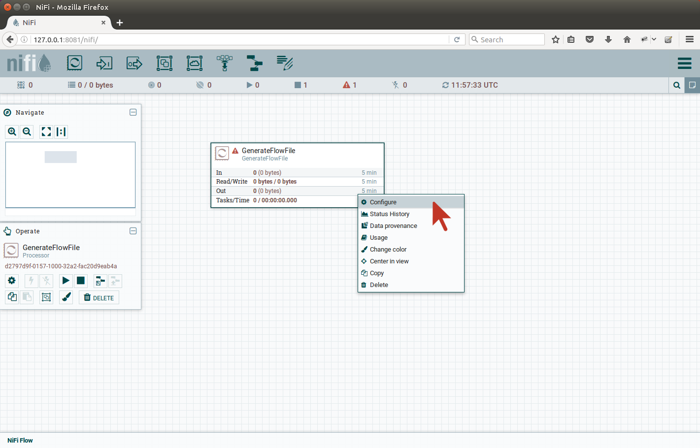 Search for GenerateFlowFile processor and select it for adding. After it is created on canvas, right-click the processor and configure it: