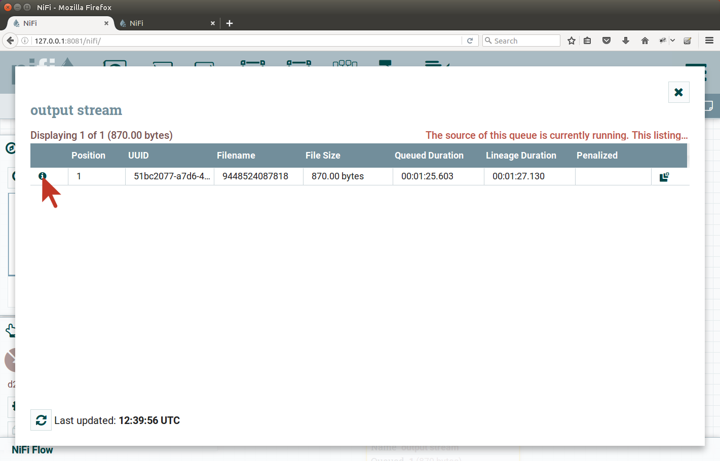 There should be one flow file queued, we click on the small info icon on the left: