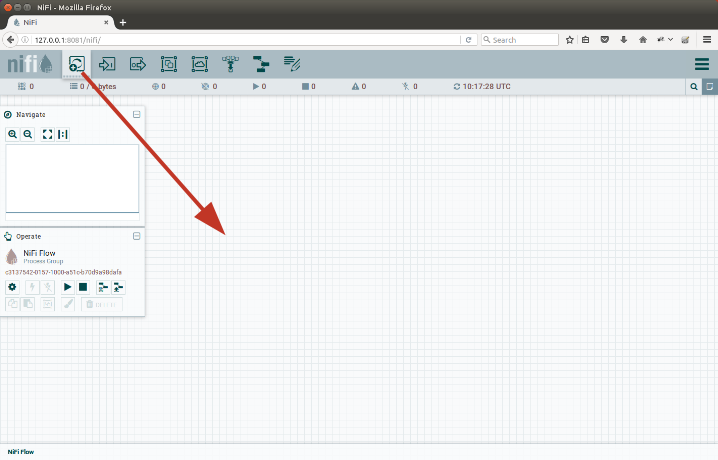 First, we add a GenerateFlowFile processor. Drag the processor icon from top-left to the canvas as shown on the picture: