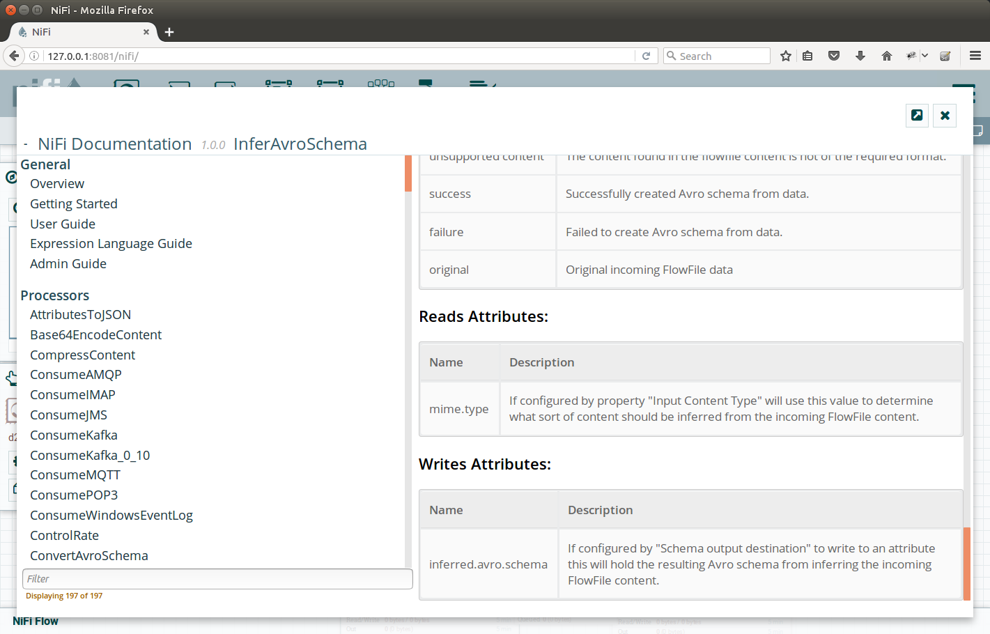 Remember the configuration of InferAvroSchema? We set it to put the inferred schema into some attribute, but what’s the name of that? As we are hurrying a little bit, we did not mention nice feature of NiFi and processors, and that is the Usage page. Each processor author creates one. Lets explore the one for InferAvroSchema, its accessible in NiFi UI by right-clicking the InferAvroSchema and selecting Usage. There, we can see at the bottom, the list of Attributes the processor writes. See the screenshot: